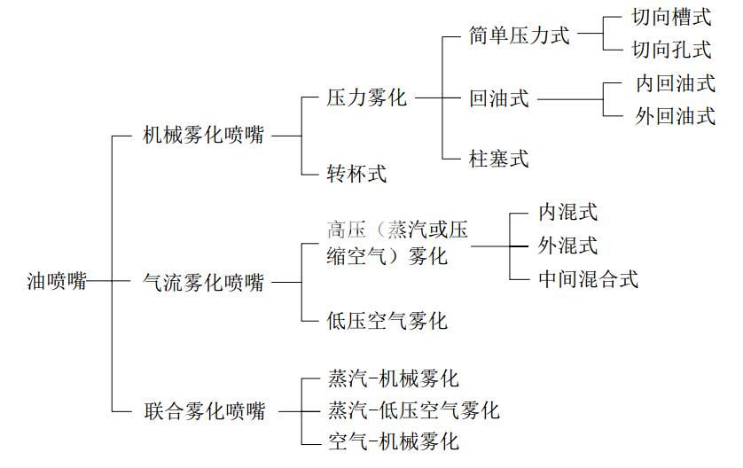 噴嘴:主要作用是霧化油滴。油嘴的主要參數有噴射角(30°、45°、60°、80°)、噴射方式(實心、空心、半空心)和噴油量。同等壓力下,較小噴油量的噴嘴,霧化效果較好。常用的油嘴有簡單機械霧化噴嘴和回油式機械霧化噴嘴,前者結構簡單,系統簡單,也比較可靠,一般用于較小負荷的燃燒器,后者結構和系統都要復雜些,但調節特性好,適用于鍋爐負荷經常有較大范圍調節時用。簡單機械霧化噴嘴有切向槽式和切向孔式,前者霧化角較大且霧化顆粒較小。