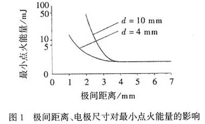 當電極間距大于臨界距離時,比較小點火能量與電極間距無關;而當電極間距小于臨界距離時,由于電極本身的吸熱,比較小點火能量隨電極間距的減小而增加。圖1為比較小點火能量與電極間距、電極尺寸的關系曲線,燃料為11%的甲烷空氣混合氣體。